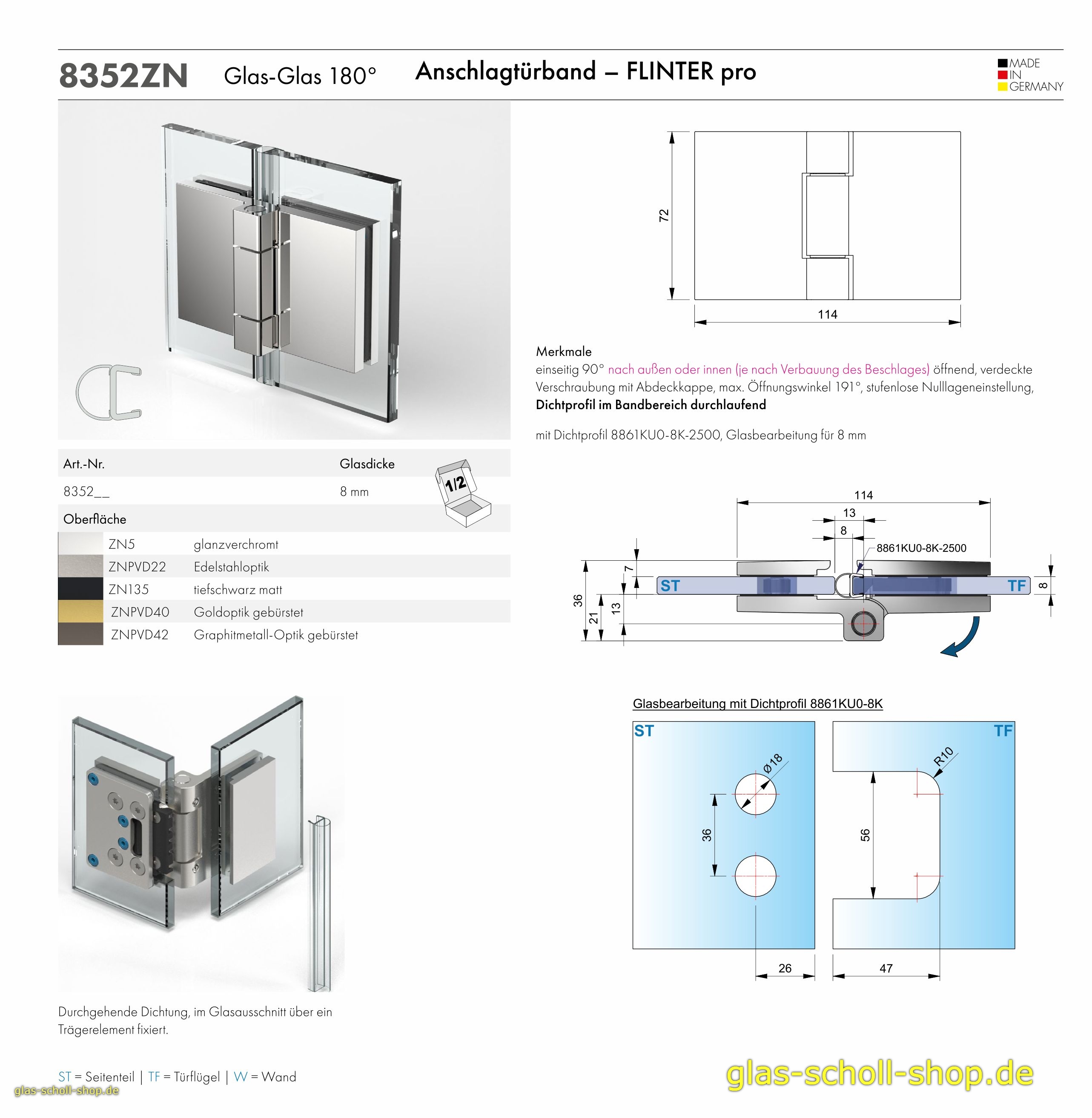 · einseitig 90° nach außen oder innen (je nach Verbauung des Beschlags öffnend
